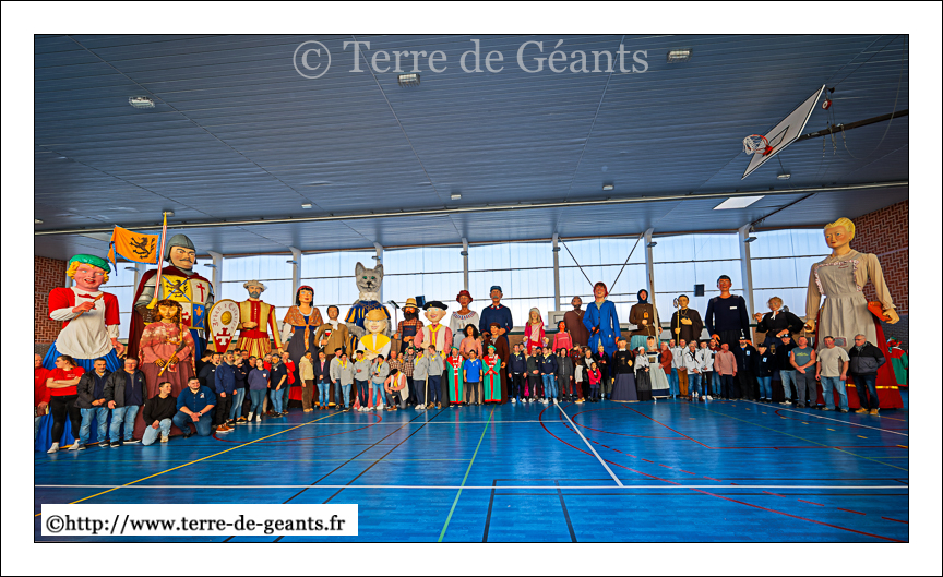 Pour la partie française, où 26 Géants ont fait le déplacement, la ville de Merville, la patrie du Caou, ce chat gigantesque, a été choisie pour les services rendus par le félidé mervillois lors de révélations précédentes du Calendrier des Géants, aussi bien sur le sol français que sur le territoire belge, à la Maison des Géants à Ath (les Géants venant lors de cette manifestation le font à titre gratuit).